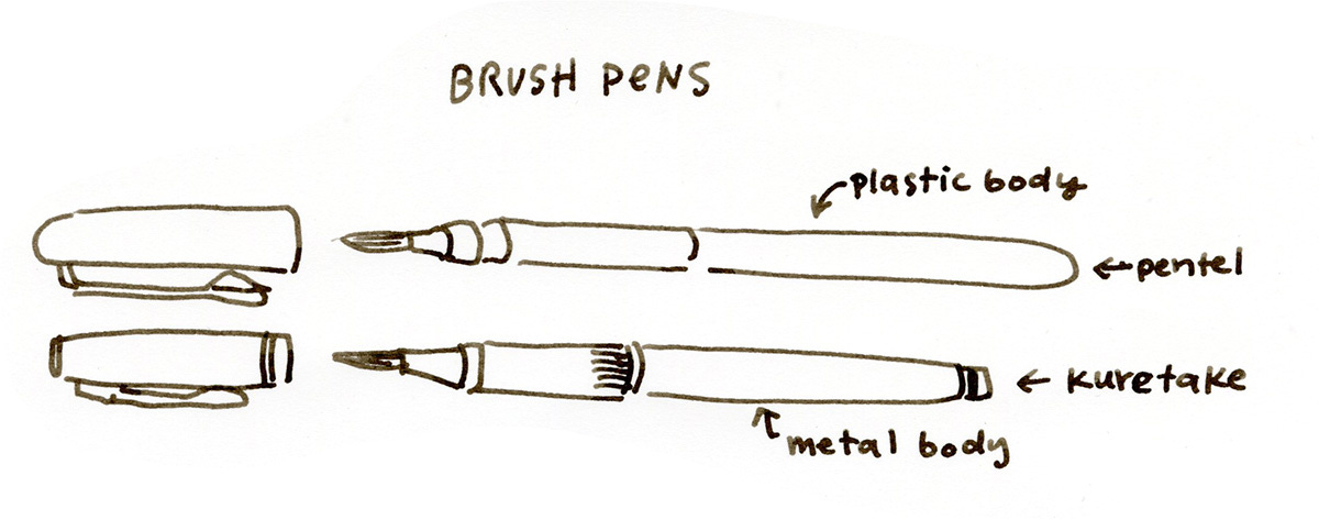 Kuretake also make brush pens which are lovely, the brush is slightly smaller than the Pentel Pocket Brushes and a bit easier to control. Plus it will take a platinum converter which makes them easier to refill. But, they are also twice (if not more) as expensive as the Pentel Pocket Brushes, so, as you can see, I have way more of the Pentel ones. You can also get piston-filled brush pens (you dip the pen in the ink and use the piston to pull it up into the body of the pen) but the one I have is horrible, I don’t recommend it. I think I got them in a pack of 5 for super cheap a few years ago and they just don’t work as well as the Pentel or Kuretake ones.