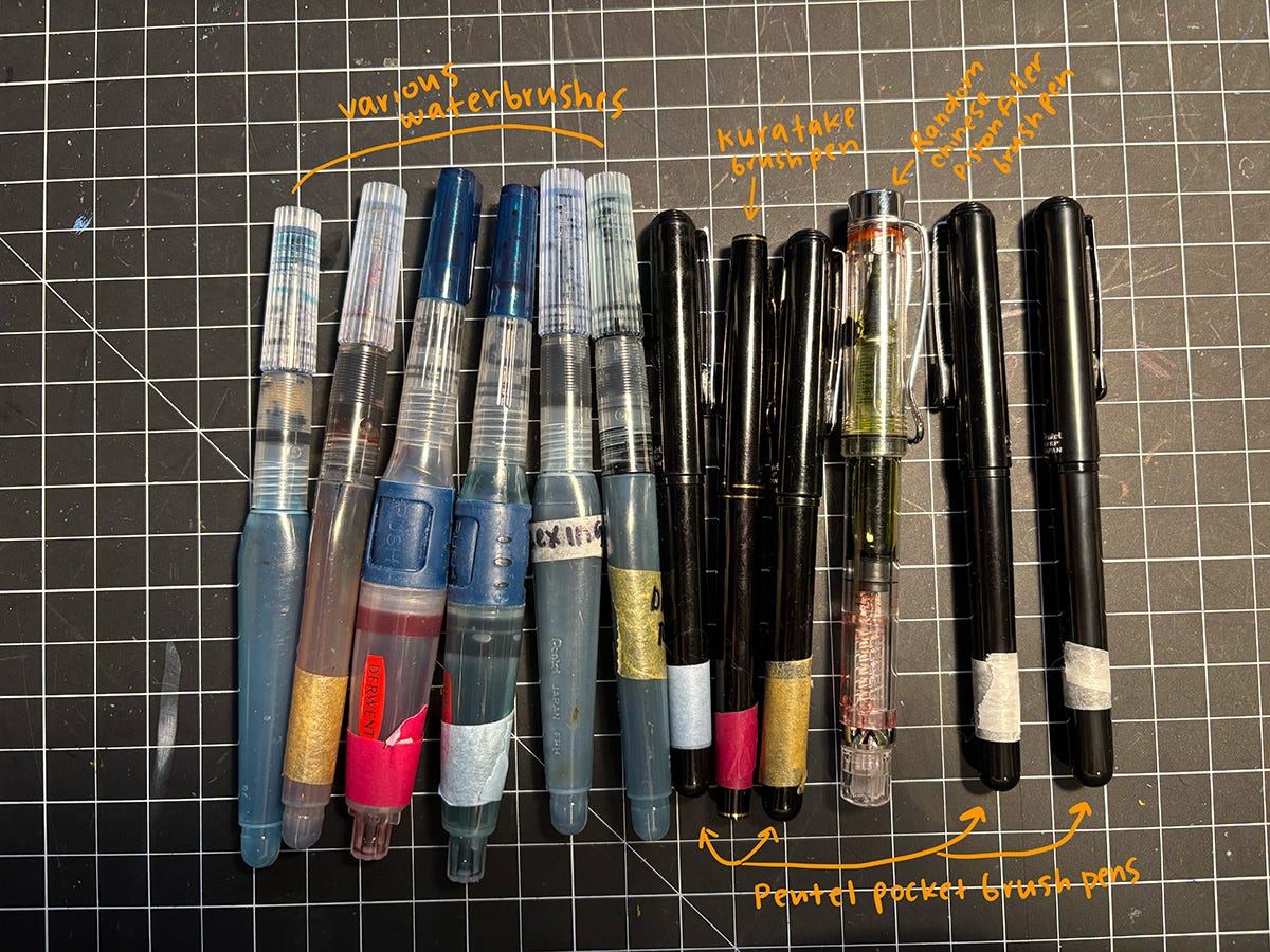 In the past I’ve mostly used water brushes with ink in them but they tend to be messy and hard to control. They dump out massive quantities of ink when I really don’t want them to – which, can be fun if you want chaos, but can also be messy and annoying when you don’t want it.