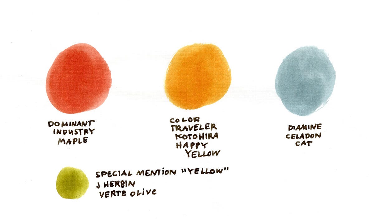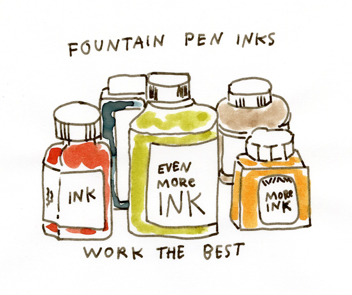 Could I just use markers and get this same effect? Probably, but I like these better because I can use up my hoard of fountain pen ink and there are so many pretty colors. I’ve only experimented a bit with the inks I have, but so far my favorite combo of inks is: