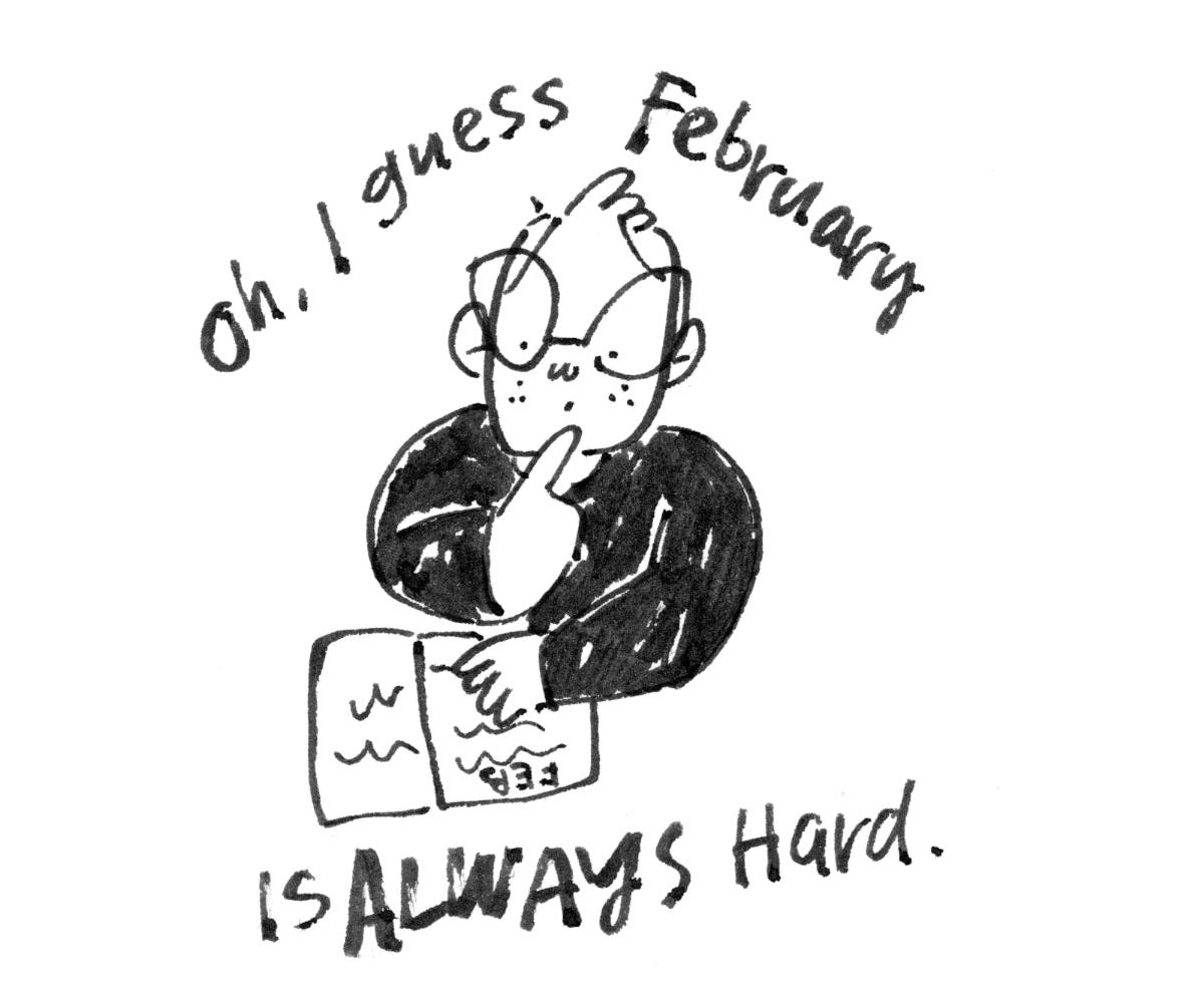 Like, relearning that February is always a slog, and that it’s ok to feel empty of ideas in February and also, that restarting things is hard. All lessons I keep relearning. I have no clue why I wrote that, the context is unclear on the page, but it does hammer home that things are cyclical and we learn something and forget it and relearn it and forget it and maybe that is just life.