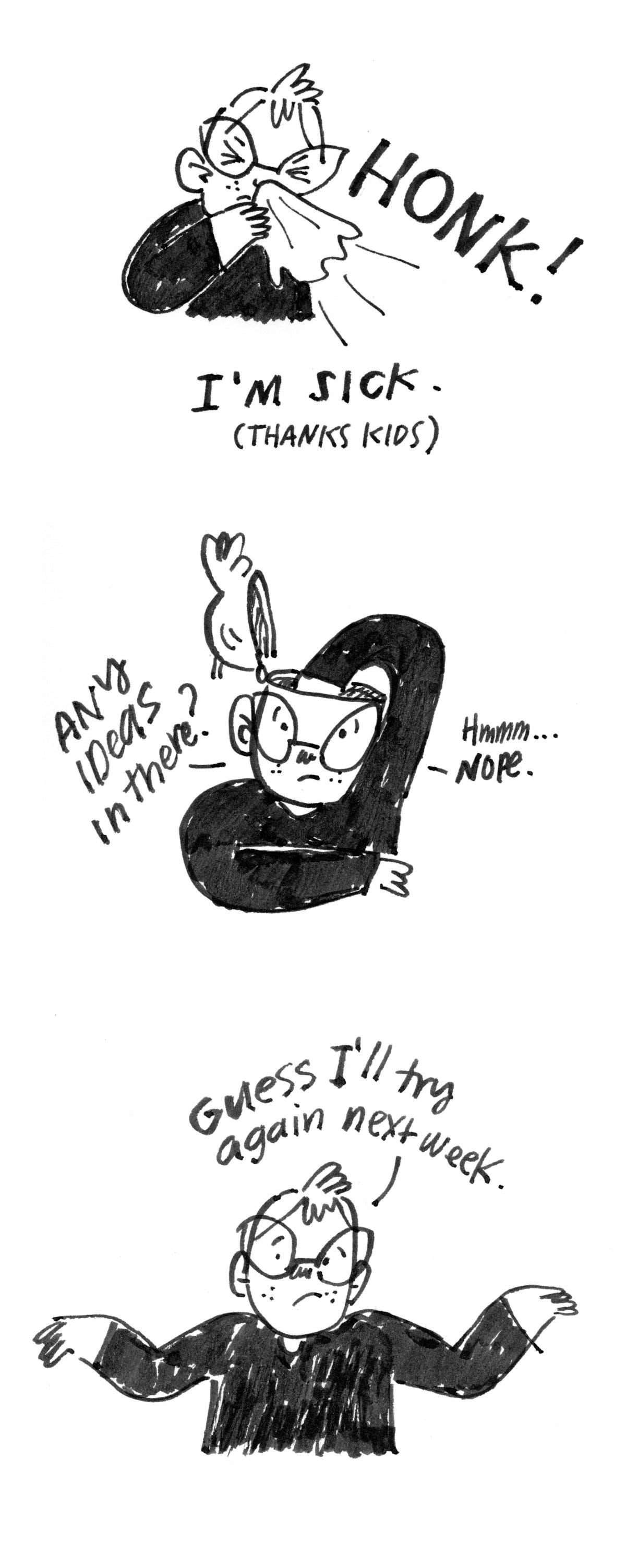 It’s hard to get momentum going again after a hiatus. Add a bit of lingering viral crud and it’s a recipe for disaster. Or, if not disaster, then a recipe for a head full of emptiness instead of ideas. So what do you do when you have no ideas and nothing to say? You just draw that, because, it’s something. And something is better than nothing when you are trying to get moving again. Something is better than nothing because something is an idea, even if it is a dumb one. Nothing is just, nothing.