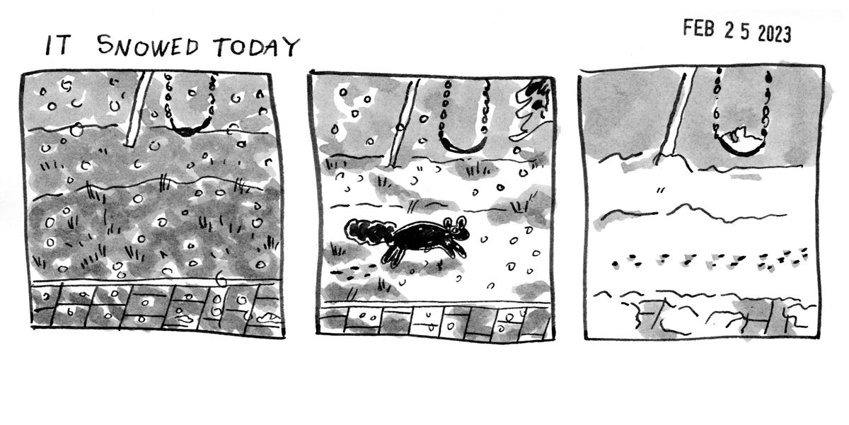 A comic I forgot I made, in a year, I didn’t remember making any comics at all. And if I wanted to, I could use this as my idea. I could make another three panel comic that reflected what I see out my window today. I could capture that moment in time. I could even look out the same window. Capture the same scene. And then next time I am scrounging around for ideas in February, I will have TWO versions of that scene to go from and then I could add a third. Anyway, it’s an idea. It doesn’t matter if it’s a good idea. All that matters is I found one when I didn’t have any.